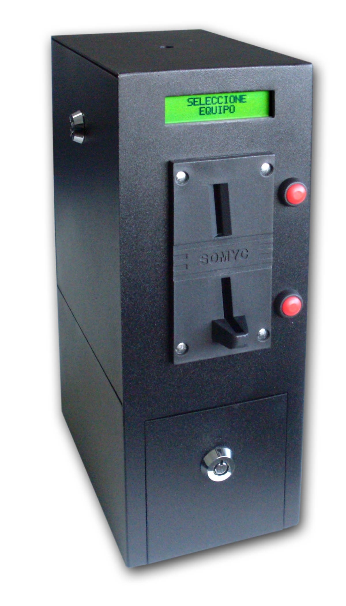 Posee un monedero electronico multimoneda de 6 canales para la programacion de monedas, fichas o cospeles. Se programa mediante un multiswitch incorporado al monedero.